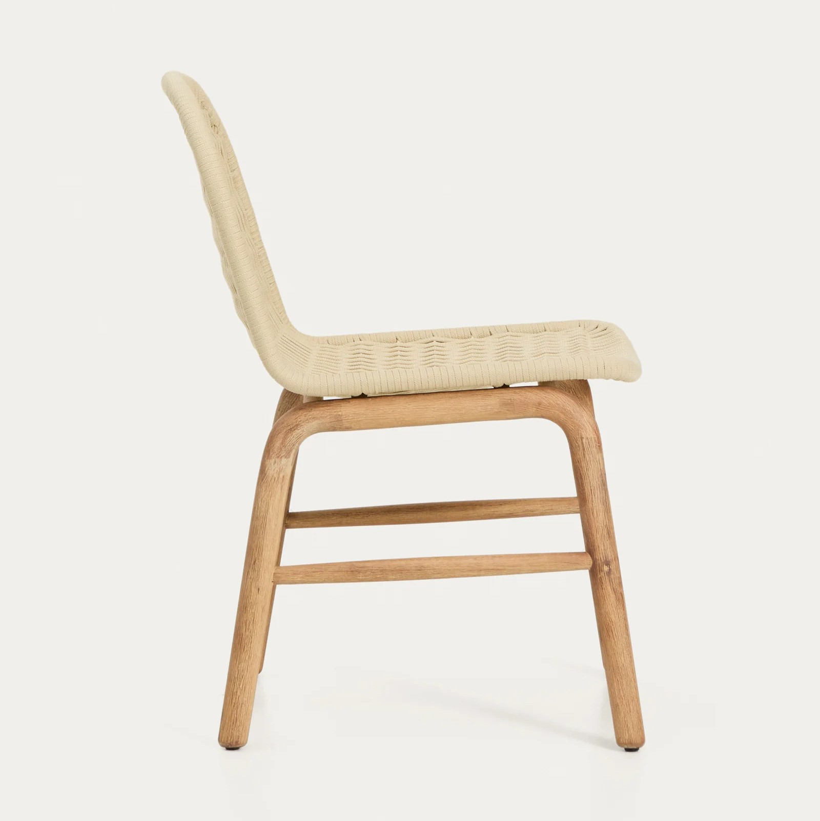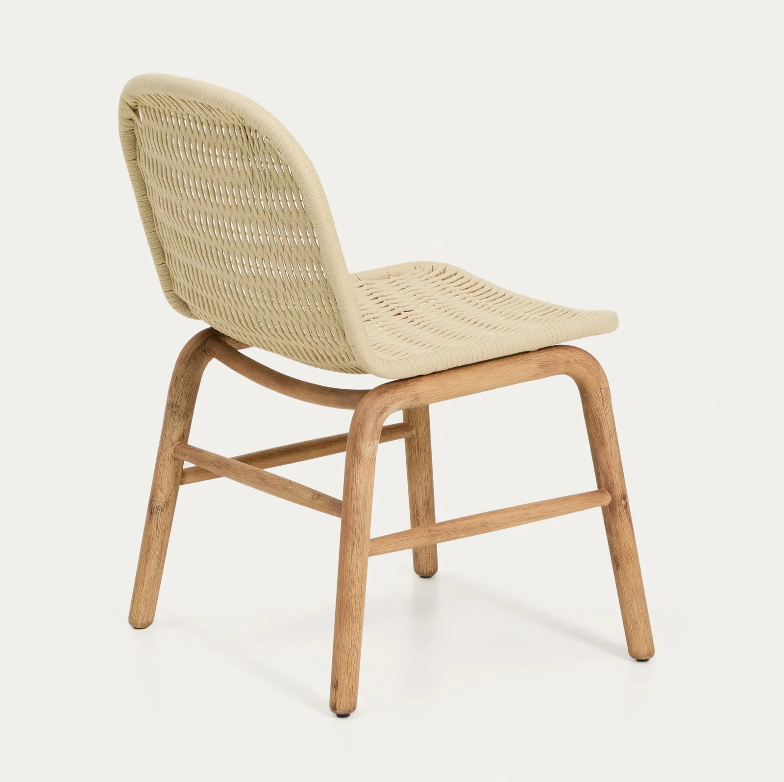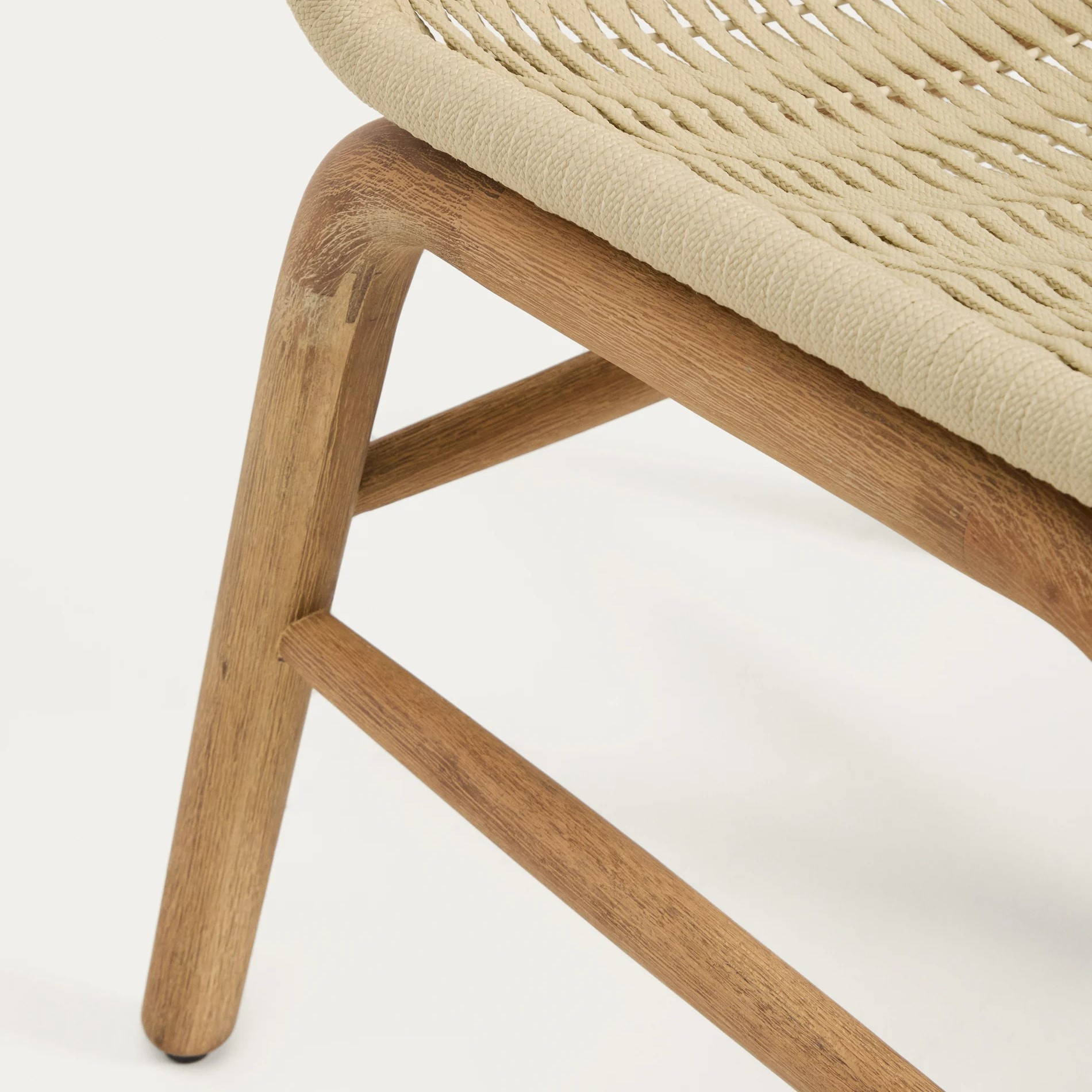 Każdy element drewna posiada unikalne usłojenie, które nadaje krzesłu indywidualny charakter i podkreśla jego naturalne piękno. Siedzisko oraz oparcie wykonano z ręcznie plecionej liny odpornej na promieniowanie UV, która zapewnia wygodę siedzenia i trwałość podczas codziennego użytkowania.