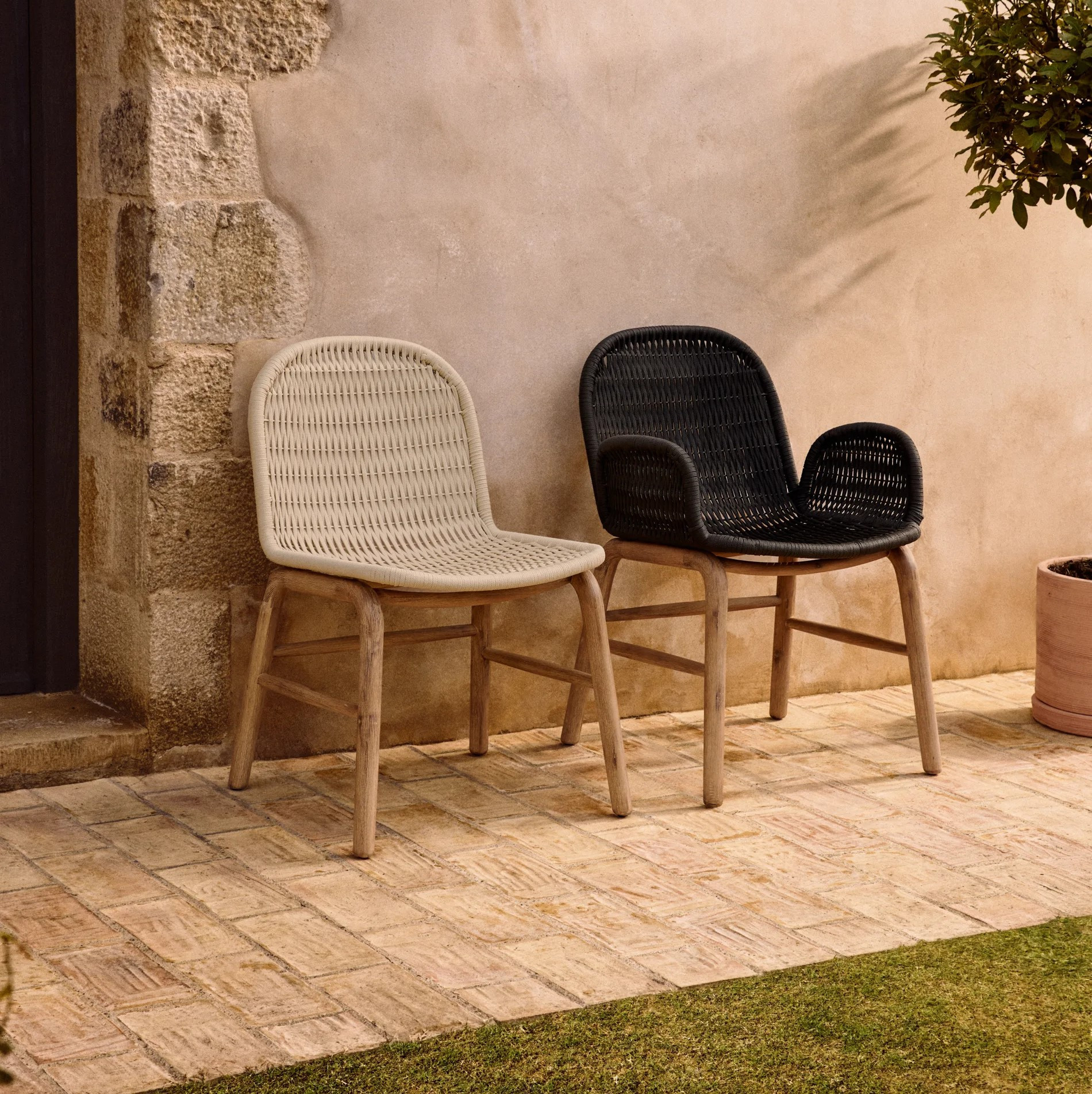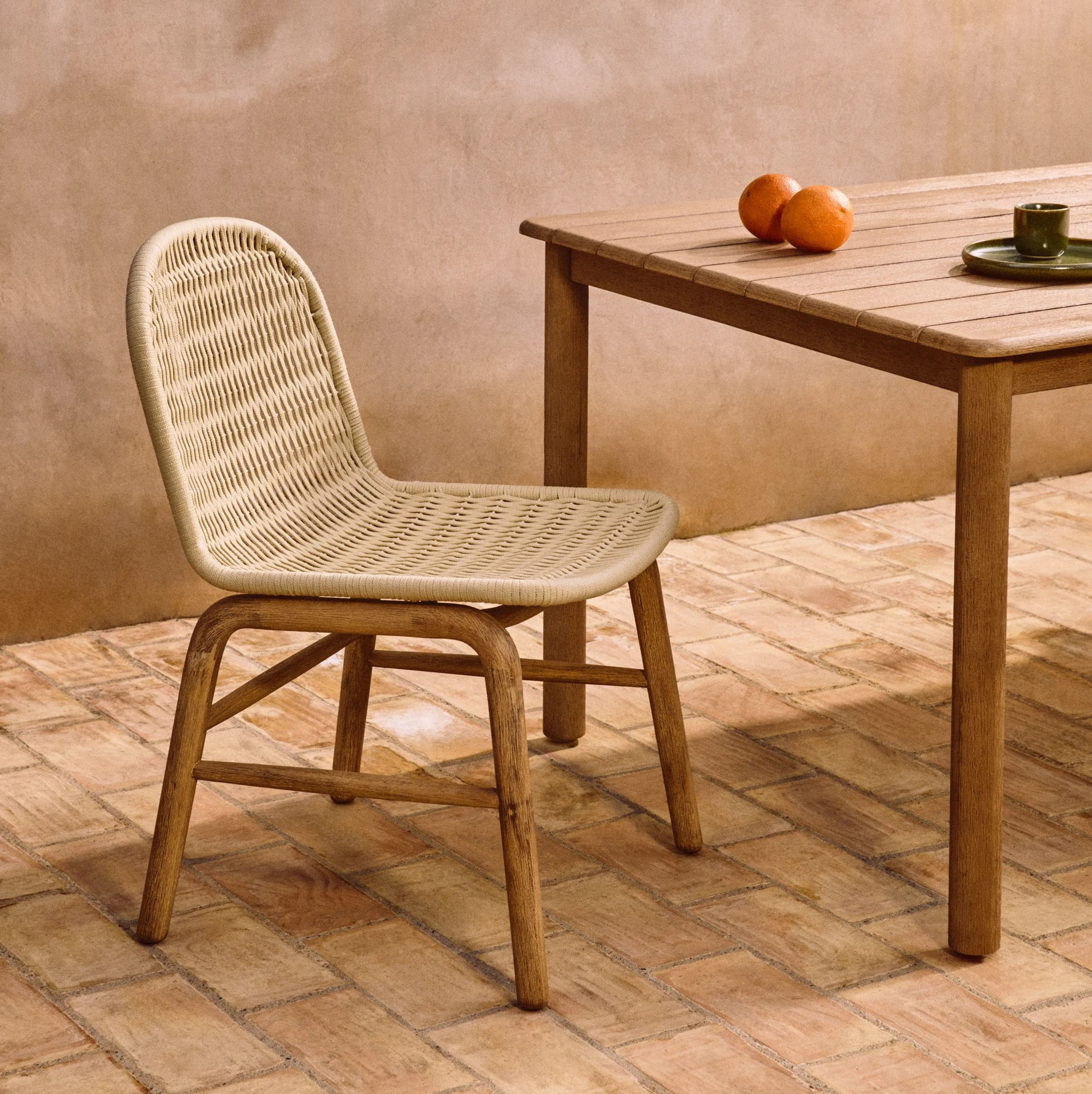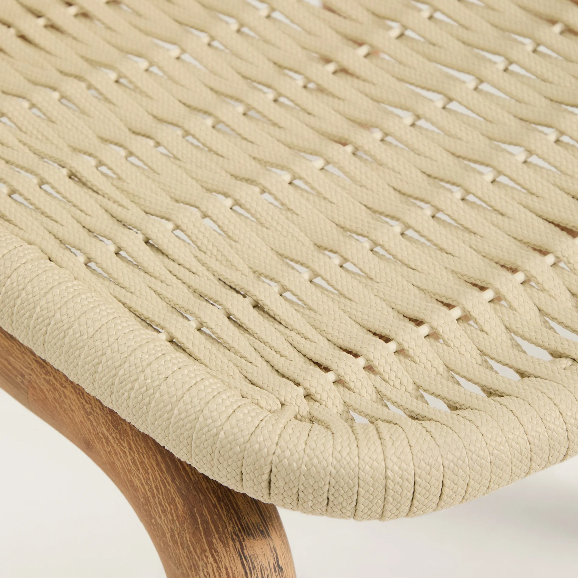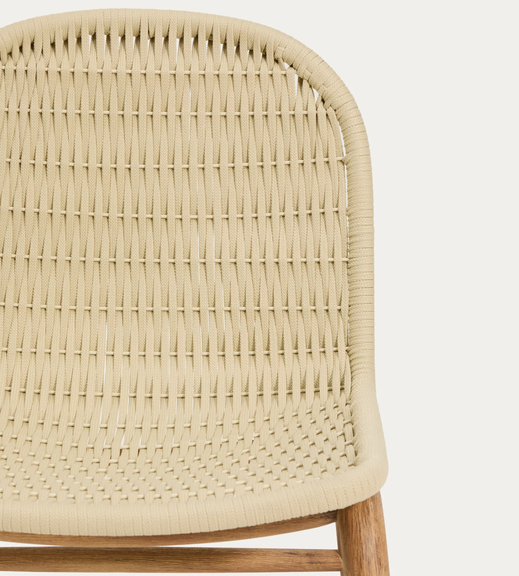 Każdy element drewna posiada unikalne usłojenie, które nadaje krzesłu indywidualny charakter i podkreśla jego naturalne piękno. Siedzisko oraz oparcie wykonano z ręcznie plecionej liny odpornej na promieniowanie UV, która zapewnia wygodę siedzenia i trwałość podczas codziennego użytkowania.