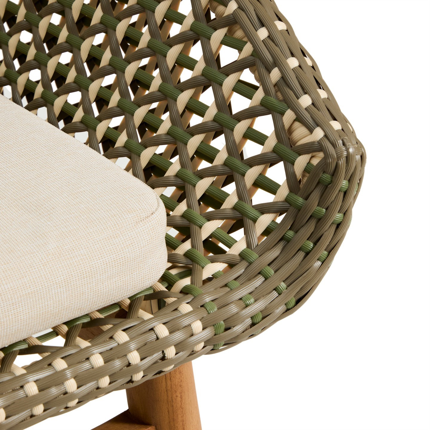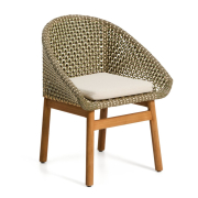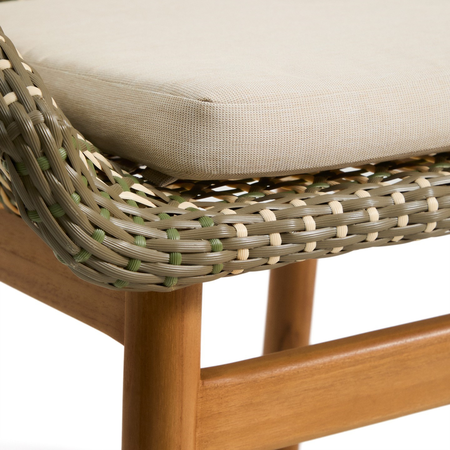 Krzesło Olbia harmonijnie łączy drewno, rattan i aluminium, tworząc elegancką i funkcjonalną formę. Podłokietniki wykonane z rattanowo-drewnianych elementów oraz gumowe podkładki chronią powierzchnię podłogi.