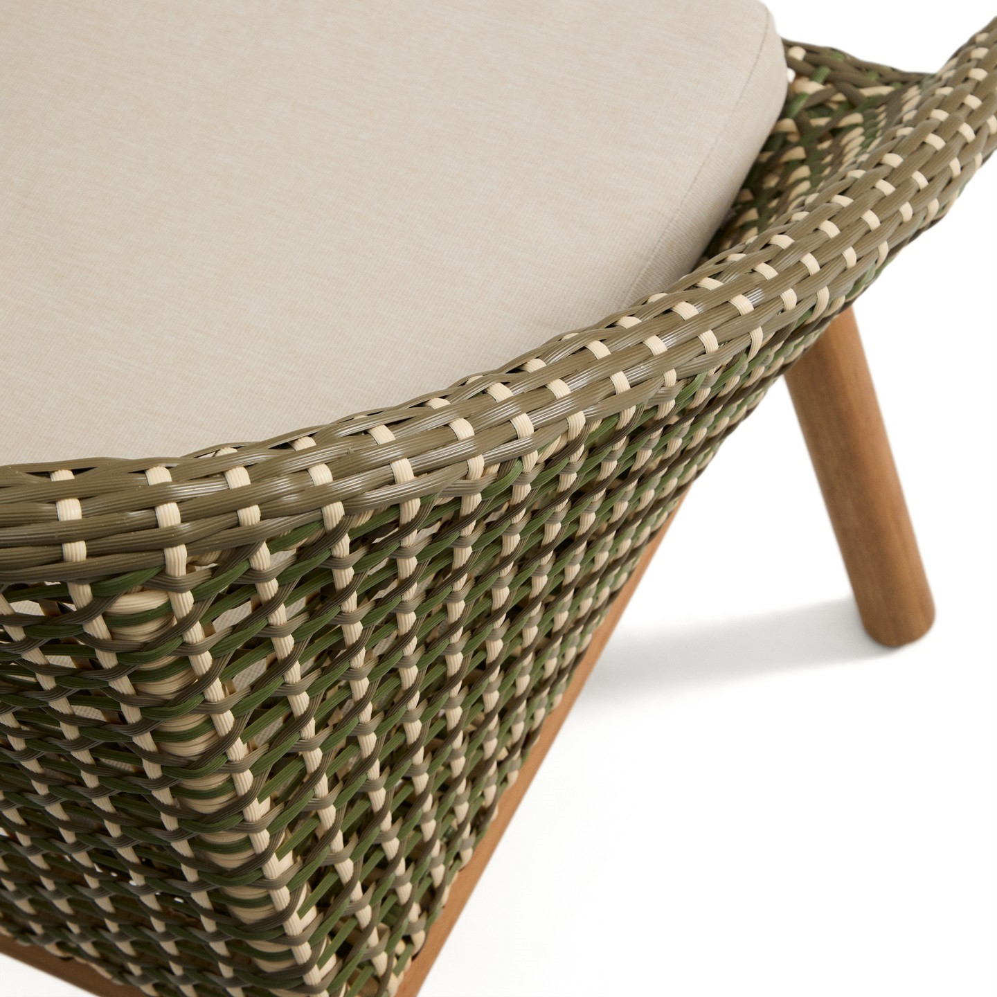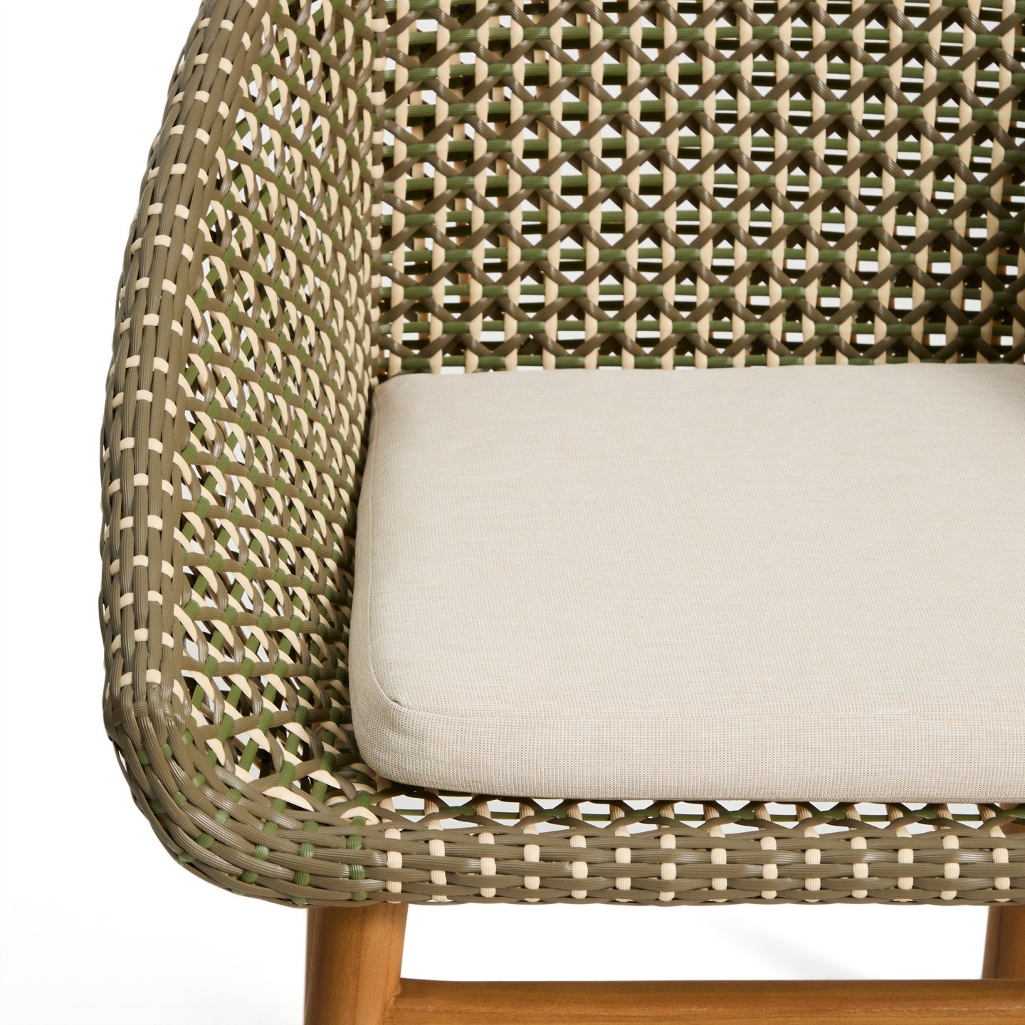 Siedzisko i oparcie wyłożone są pianką o gęstości 230 kg/m³ i pokryte tkaniną Olefina 100%, odporną na wodę i promieniowanie UV, co zapewnia komfort oraz łatwość w utrzymaniu czystości. Zdejmowane pokrowce umożliwiają szybkie pranie, a konstrukcja sprawia, że krzesło nadaje się do codziennego użytkowania na zewnątrz.