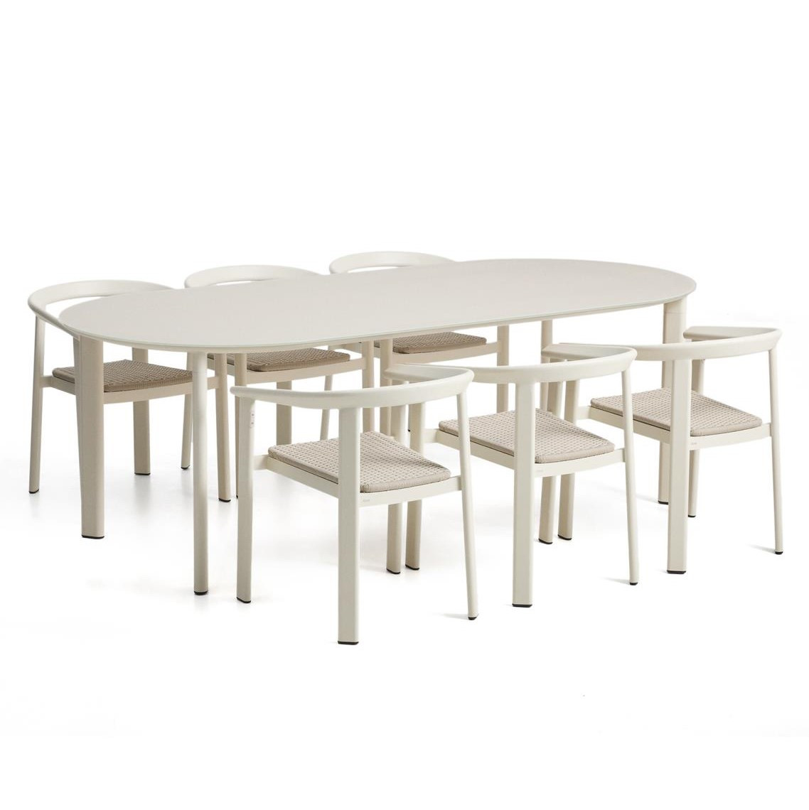 Krzesła z kolekcji Erice wyróżniają się siedziskiem wykonanym z ręcznie plecionej liny odpornej na promieniowanie UV, która nadaje całości eleganckiego, naturalnego charakteru i zapewnia komfort siedzenia nawet podczas długich spotkań przy stole.
