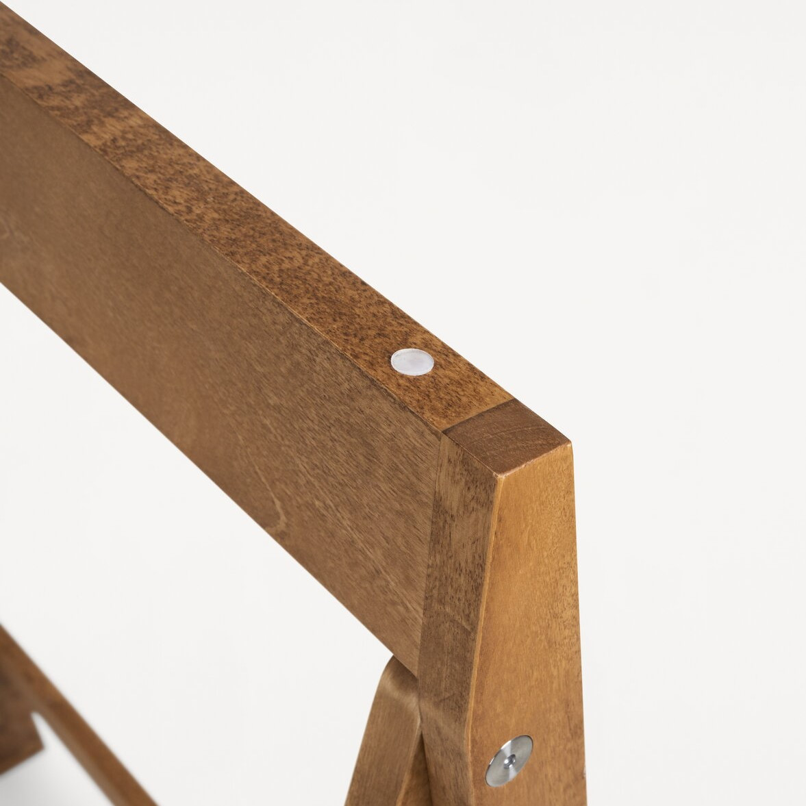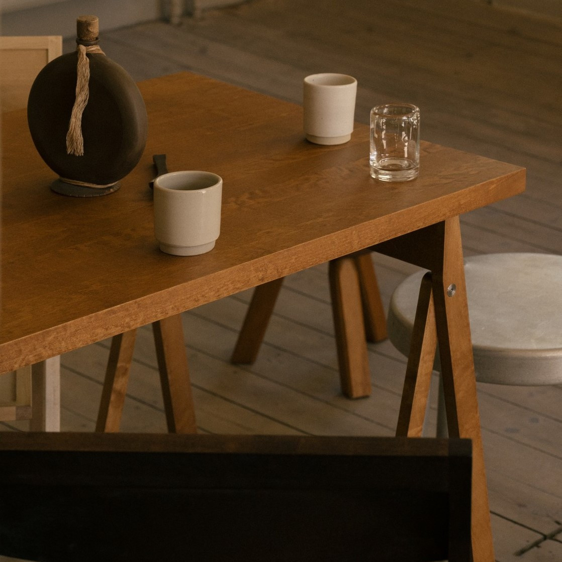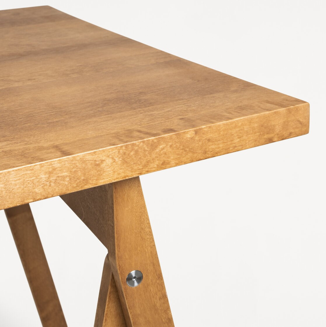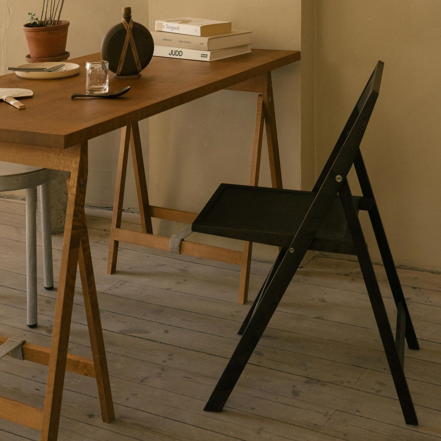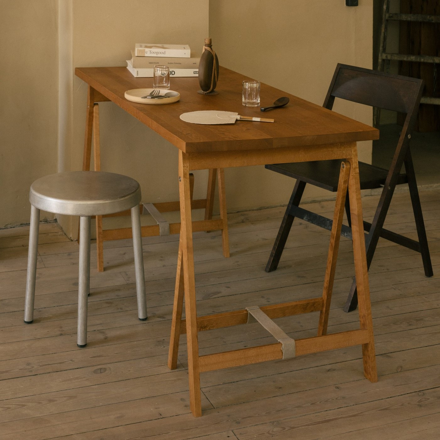 Stół wykonany jest z litego drewna brzozowego, dzięki czemu należy do kategorii stołów z litego drewna brzozowego, wykończonych bejcą i lakierem w ciepłym odcieniu Warm Brown, który z czasem zyskuje unikalną patynę. Stabilność zapewniają antypoślizgowe podkładki żelowe oraz taśmy z recyklingowanej bawełny, co wyróżnia go jako stabilny stół mobilny do małych przestrzeni. Lekka, a jednocześnie trwała konstrukcja sprawdza się jako stół jadalniany składany lub minimalistyczne biurko drewniane, szczególnie w aranżacjach w stylu skandynawskim.